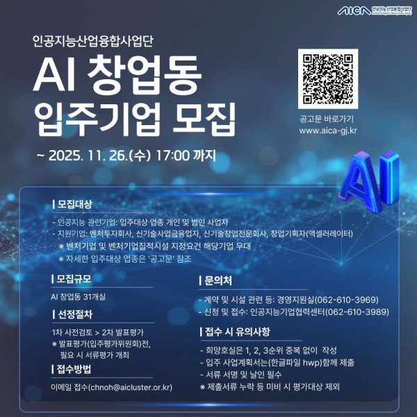 인공지능산업융합사업단에서는 『대한민국 인공지능 혁신거점 : 광주 인공지능 중심 산업융합 집적단지』에서, 국내 최대 글로벌 규모의 국가 AI데이터센터 및 실증 인프라와 함께, AI분야 기술개발·산업발전과 AI 중심 산업융합 생태계 활성화에 기여할 성장잠재력이 우수한 입주기업을 모집하오니 많은 신청 바랍니다.